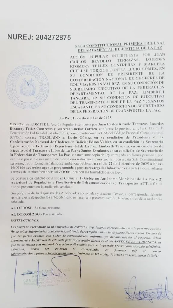 Según la resolución de la Sala Constitucional, el lunes 22 de diciembre, a las 16.00, se realizará la audiencia de la acción, de forma virtual. En el encuentro también deben participar el alcalde de La Paz, Iván Arias, y la Autoridad de Regulación y Fiscalización de Telecomunicaciones y Transportes (ATT), para que expliquen el marco regulatorio vigente.