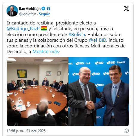 El presidente del BID, Ilan Goldfajn, expresó su respaldo al próximo gobierno boliviano y señaló que el diálogo avanza “sobre sus planes y la colaboración del BID, incluso sobre la coordinación con otros Bancos Multilaterales de Desarrollo, a través de un plan de acompañamiento en tres etapas: transición a corto plazo, estabilización con protección social y reformas para el crecimiento sostenido”.