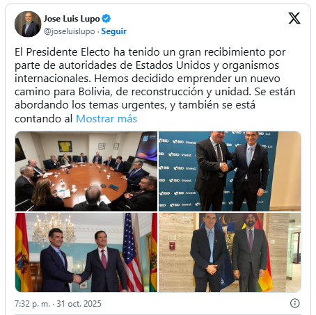 Hasta la noche de este viernes, el presidente electo de Bolivia, Rodrigo Paz, sostuvo reuniones con ejecutivos del Fondo Monetario Internacional (FMI), el Banco Mundial (BM), el Banco Interamericano de Desarrollo (BID) y el secretario de Estado de EEUU, Marco Rubio.