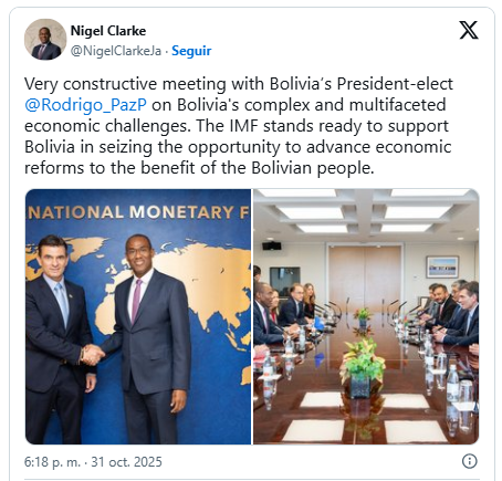Nigel Clarke, subdirector gerente del FMI, señaló en su cuenta de X que en la reunión con Paz se abordaron “los complejos y multifacéticos desafíos económicos del país” y añadió que este organismo “está dispuesto a apoyar a Bolivia para que aproveche la oportunidad de impulsar reformas económicas en beneficio del pueblo boliviano”.