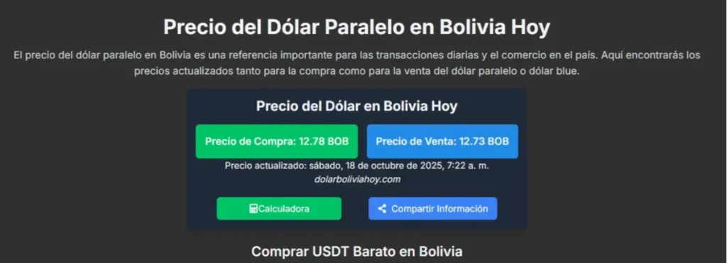 Según datos emitidos este sábado 18 de octubre de 2025, por el portal especializado dolarboliviahoy.com, la divisa estadounidense se cotiza en el mercado paralelo con un precio a la venta de 12.73 (BOB), y un precio de compra de 12.78 BOB.