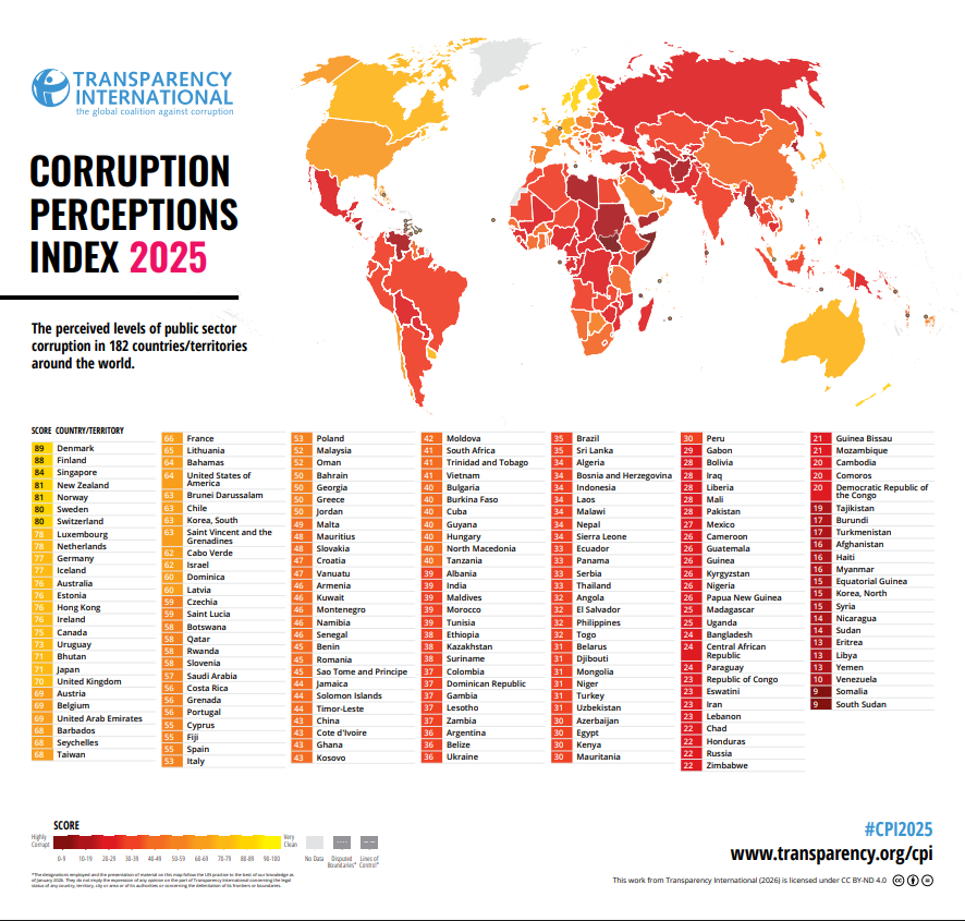 El Índice de Percepción de la Corrupción 2025 de Transparencia Internacional ubica a Bolivia en el puesto 136 entre 180 países evaluados, tres posiciones por debajo del registro del año anterior.
