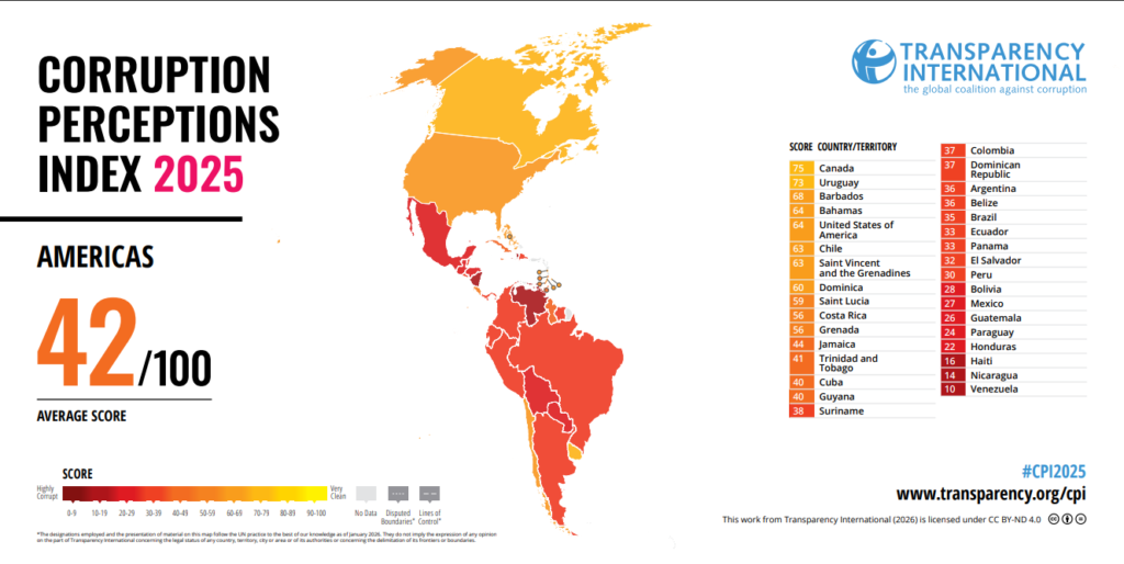 El reporte señala que la región de las Américas registra una puntuación promedio de 42 sobre 100, sin avances significativos en la lucha contra la corrupción.