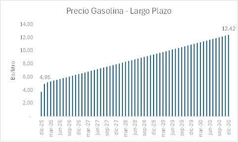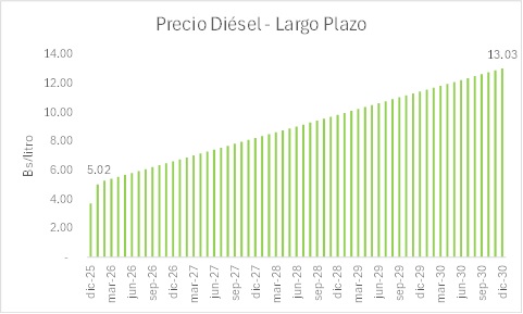 Ahora asuma que los precios de la gasolina y diésel oíl se incrementan a (+/-) Bs/litro 5.00 en enero de 2026 y luego, poco a poco durante cinco años; además el incremento se realiza de forma equilibrada (no à la Evo). Algo como esto: