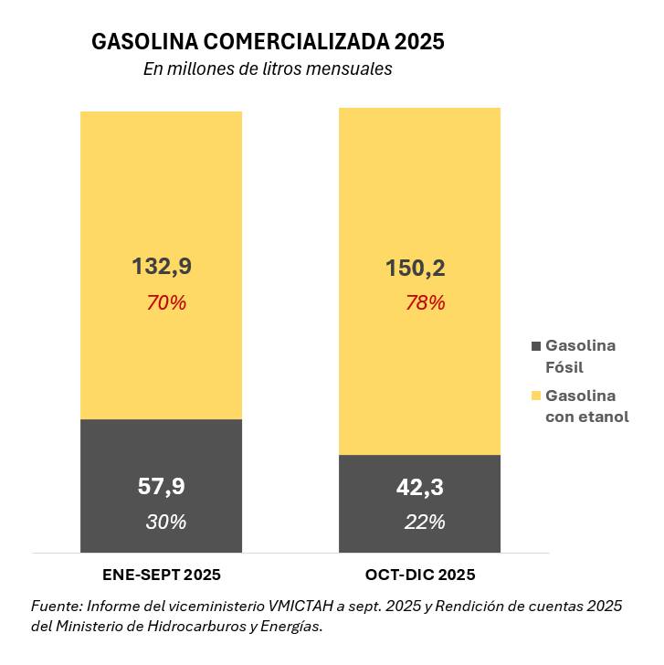 La mezcla con etanol no es de ahora, pero algo cambió con el nuevo gobierno. Hay más gasolina con etanol en los surtidores. Fíjense en el gráfico, aumentó en 17,2 millones de litros mensuales y, en contrapartida, bajó la gasolina fósil. Además, el porcentaje de la mezcla alcanzó el tope máximo de 12%, según la última rendición de cuentas (ver cuadro). Es muy probable que el gobierno de Rodrigo Paz haya o esté mezclando por encima de ese tope, porque existen por lo menos dos indicios en ese sentido.