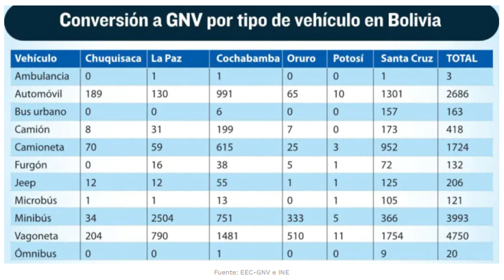 Entretanto, el INE remitió en un boletín estadístico que, en 2024 los vehículos convertidos a GNV llegaban a 14.216 de los 2.583.283 de motorizados que conforman el parque automotor (cifras hasta la gestión 2024).