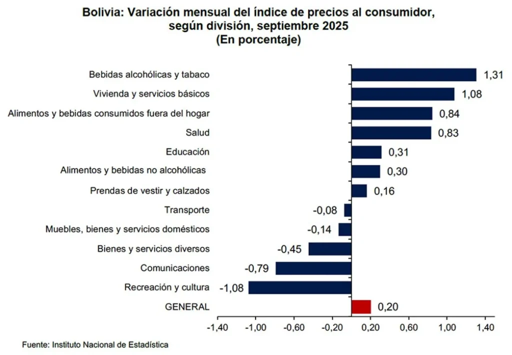 Por divisiones y grupos, el incremento de 0,20% del IPC registrado en septiembre 2025 se explica, principalmente, por la variación positiva de los precios en las divisiones de bebidas alcohólicas y tabaco; vivienda y servicios básicos; alimentos y bebidas consumidas fuera del hogar; salud; educación; alimentos y bebidas no alcohólicas y prendas de vestir y calzados.