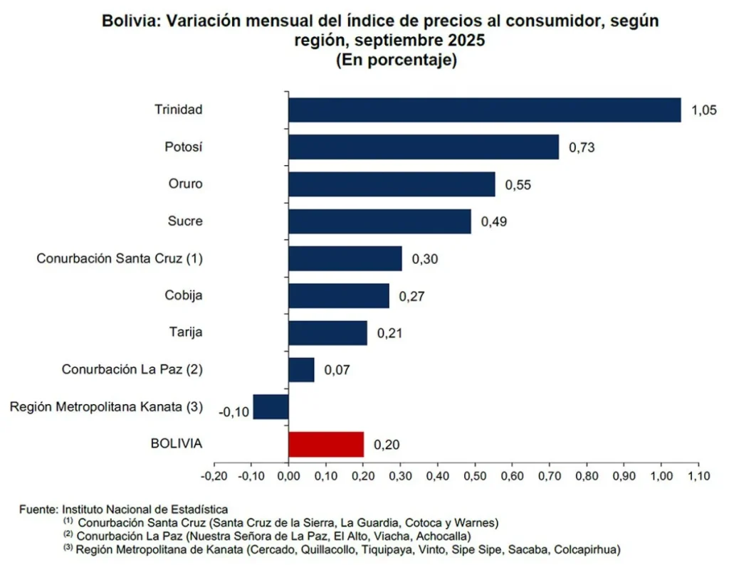 El incremento de precios, reportado en las ciudades capitales y conurbaciones, fue de: Trinidad (1,05%); Potosí (0,73%); Oruro (0,55%); Sucre (0,49%); Conurbación Santa Cruz (0,30%); Cobija (0,27%); Tarija (0,21%) y Conurbación La Paz (0,07%).