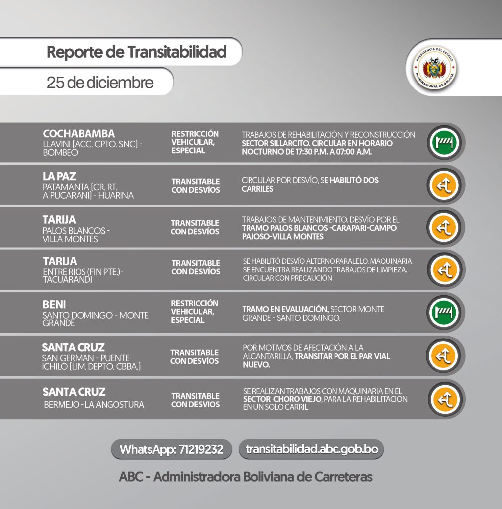 La mañana de este jueves, feriado de Navidad, cerca de las 10:30 no se reportaba ningún bloqueo carretero, según la página de transitabilidad de la Administradora Boliviana de Carreteras (ABC).